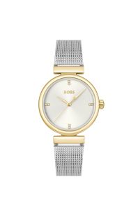 Käekella ümarat kuldset korpust täiendab puhas hõbevalge sihverplaat, mida ehib päikesekiirte muster ning neli säravat kristalli kellaaja tähistena. Minimalistlik disain keskendub selgetele joontele, jättes sihverplaadile vaid elegantsed kuldsed osutid ja BOSS logo. Erilist tähelepanu püüab kella kahevärviline lahendus, kus kuldsed kinnitused ühenduvad mugava roostevabast terasest punutud ehk mesh-rihmaga. Käekell on varustatud kvartsmehhanismiga.