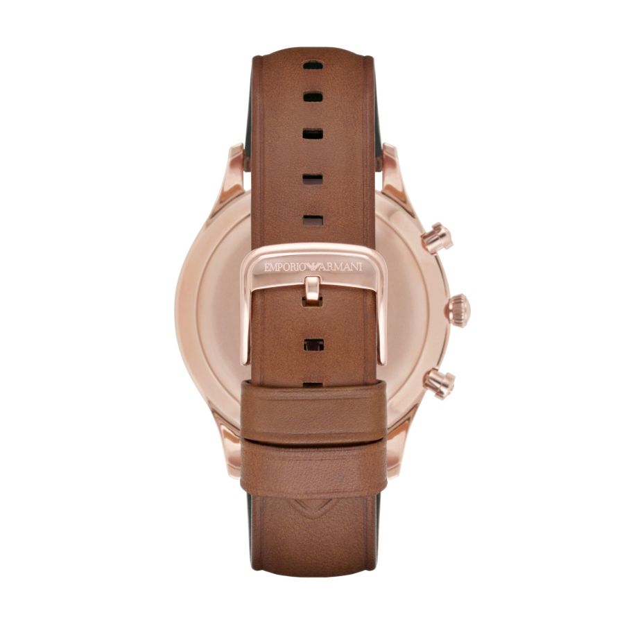 Haara endaga see Emporio Armani ustav kaaslane. Kellal on roostevaba terasest kulla toonis korpus, milles põksub Quartz mehhanism. Kella teeb randmel mugavaks pruun nahast rihm.