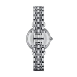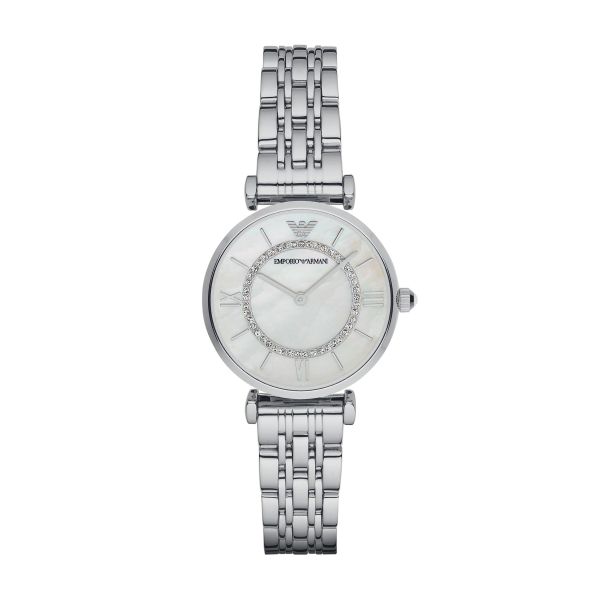 Kaunis ja luksuslik Emporio Armani naiste käekell, mille hõbedane korpus ja rihm on valmistatud roostevabast terasest. Pärlmutrist sihverplaati kaunistavad hõbedased detailid ning valged tsirkoonid. Kvartsmehhanismiga kella sihverplaati katab mineraalklaas.