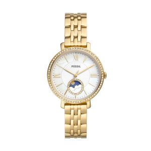 Kaunis Fossil Jacqueline on sobiv kaaslane igaks hetkeks. Käekella kuldne korpus ja rihm on valmistatud roostevabast terasest. Kuldsete rooma numbritega ja kuufaasi näidikuga varustatud pärlmutter sihverplaat on kaitstud mineraalklaasiga.