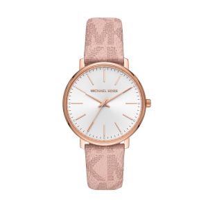Lihtne ja stiilne roosa kulla tooni roostevabast terasest korpusega käekell, mille valgele sihverplaadile lisavad sära valged kristallid. Kvartsmehhanismiga käekellal on roosa pressitud MK logomustriga nahkrihm.