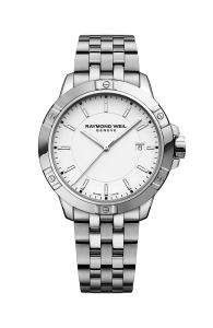 Raymond Weil Tango 8160-ST-30041 on stiilne ja maskuliinne meeste käekell, mis ühendab klassikalise esteetika muljetavaldavate tehniliste näitajatega. Selle 41-millimeetrist roostevabast terasest korpust raamib sarjale iseloomulik fikseeritud raam, mida kaunistavad kuus dekoratiivset kruvi. Karge valge sihverplaat on varustatud pimedas helendavate hõbedaste indeksite ja osutitega, tagades kellaaja selge loetavuse igas olukorras. Sihverplaati kaitseb peegeldusvastase kattega safiirklaas, mis on äärmiselt vastupidav kriimustustele ja hoiab kella välimuse värskena. Tänu erakordsele 300-meetrisele veekindlusele ja keeratavale kroonnupule sobib see mudel suurepäraselt ka veespordi harrastajatele või sukeldumiseks. Kella hoiab kindlalt randmel vastupidav roostevabast terasest kett, mis on varustatud turvalise topeltkinnitusega.
