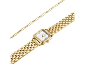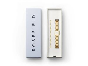 Rosefield The Boxelle naiste kinkekomplektis on kaunis valge sihverplaadiga käekell ja kuldne käekett. Roostevabast terasest korpuse ja rihmaga käekell on varustatud kvartsmehhanismiga. Sihverplaati katab mineraalklaas.