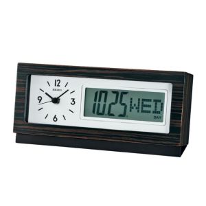 Seiko kvartsmehhanismiga lauakell. Mõõdud 11,8 x 25 x 6,6 cm. Digitaalne nädala- ja kuupäevanäidik.