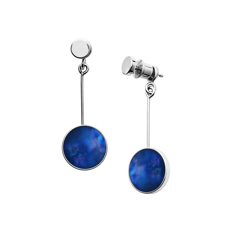 Imelised Skagen Agnethe kõrvarõngad on valmistatud roostevabast terasest ja neid kaunistavad sinised pärlmutrist kettad.