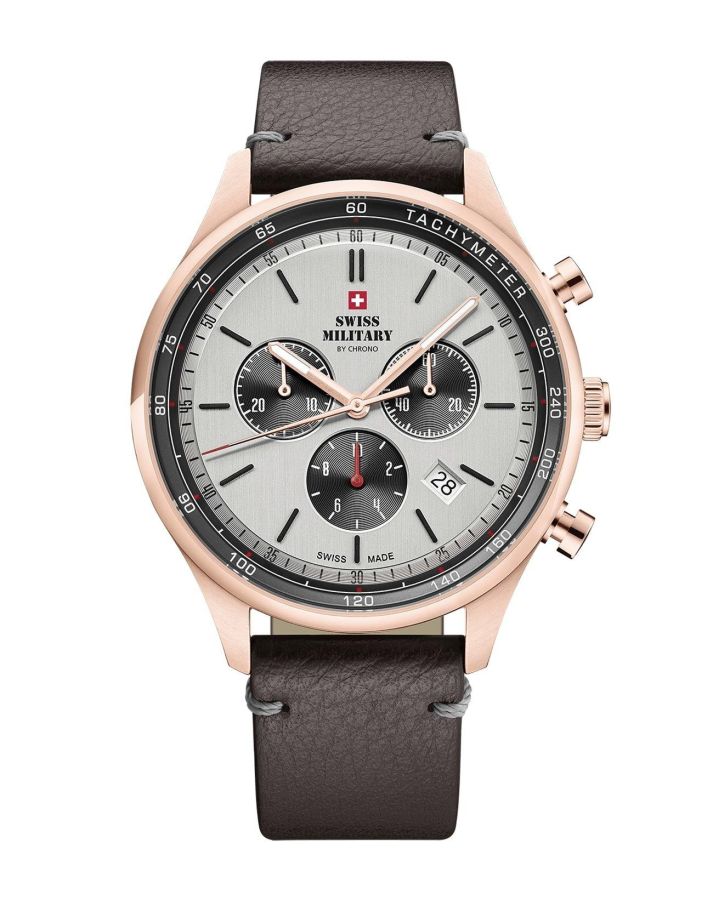 Vintage-stiilis Swiss Military meeste käekell, mis on loodud trendikatele meestele. Kellal on pilkupüüdev sihverplaat tahhümeetri skaalaga ja kronograaf-loenduritega, mis on kaitstud tänu safiir kattega tugevdatud mineraalklaasile. Tänu pimedas helendavatele indeksitele ja seieritele saad näha kellaaega igas olukorras. Kella veekindlus on 10 ATM. See on kell, mis aitab rõhutada sinu individuaalsust ja laitmatut maitset.