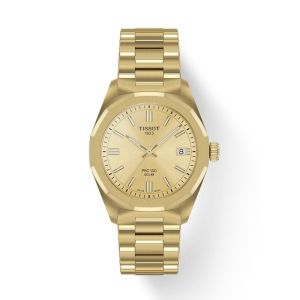 Tissot PRC 100 Solar on elegantne ja funktsionaalne käekell, mis on loodud kandjale, kes hindab nii stiili kui ka jätkusuutlikkust. Selle mudeli 34 mm korpus on valmistatud kvaliteetsest roostevabast terasest, mis on kaetud luksusliku kollase kulla tooniga (PVD). Kella suurimaks eeliseks on selle Solar-mehhanism, mis muundab nii päikese- kui ka tehisvalguse energiaks, välistades vajaduse regulaarse patareivahetuse järele ja tagades kella pikaajalise töökindluse. Kella disain on peen ja harmooniline, kus kuldne sihverplaat sulandub ühte korpuse ja rihmaga. Indeksid ja osutid on kaetud Super-LumiNova kihiga, mis tagab loetavuse ka hämarates oludes. Kellal on safiirklaas ning veekindlus 10 ATM.