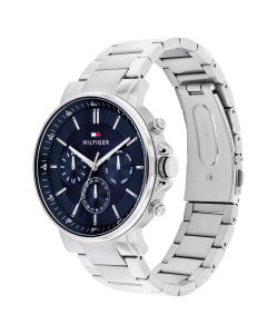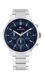Klassikaline Tommy Hilfigeri käekell on täiuslik segu minimalistlikust disainist ja igapäevasest praktilisusest. Kellal on sinine sihverplaat, mida kaunistavad elegantsed hõbedased indeksid ja brändi äratuntav logo. Kolm peent alam-sihverplaati kuvavad mugavalt nii kuupäeva, nädalapäeva kui ka 24-tunni kellaaega. Poleeritud roostevabast terasest korpus lisab aksessuaarile karget sära, harmoneerudes suurepäraselt kella üldise stiiliga.